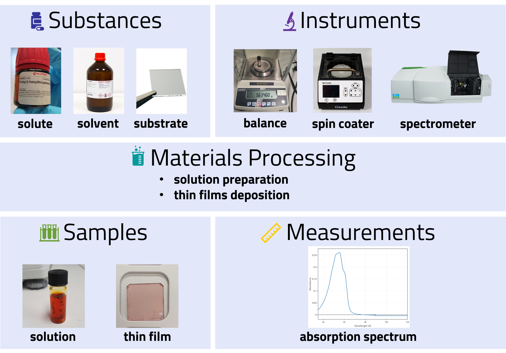 In this tutorial, we will use an example experiment involving the preparation of solution-processed polymer thin films and the measurement of their optical absorption spectrum.