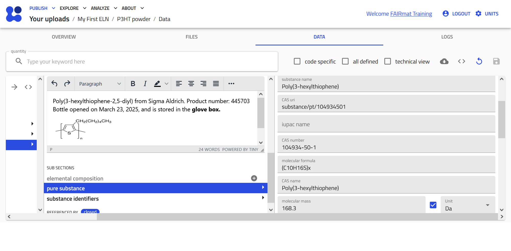 Create an ELN entry in NOMAD for P3HT solution in chloroform. Reference the sample to its components (P3HT powder and chloroform).