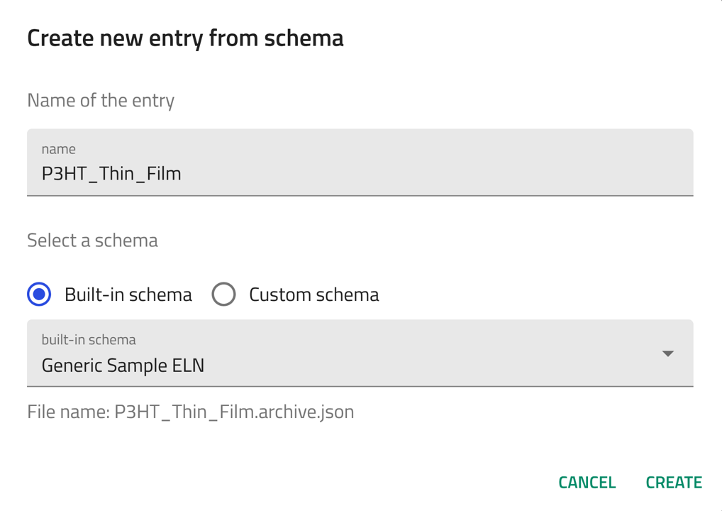 Now, let's create an entry using the built-in Generic Sample ELN schema for P3HT thin film. Follow the steps of creating an entry described above and select Generic Sample ELN from the drop-down menu in step 4.