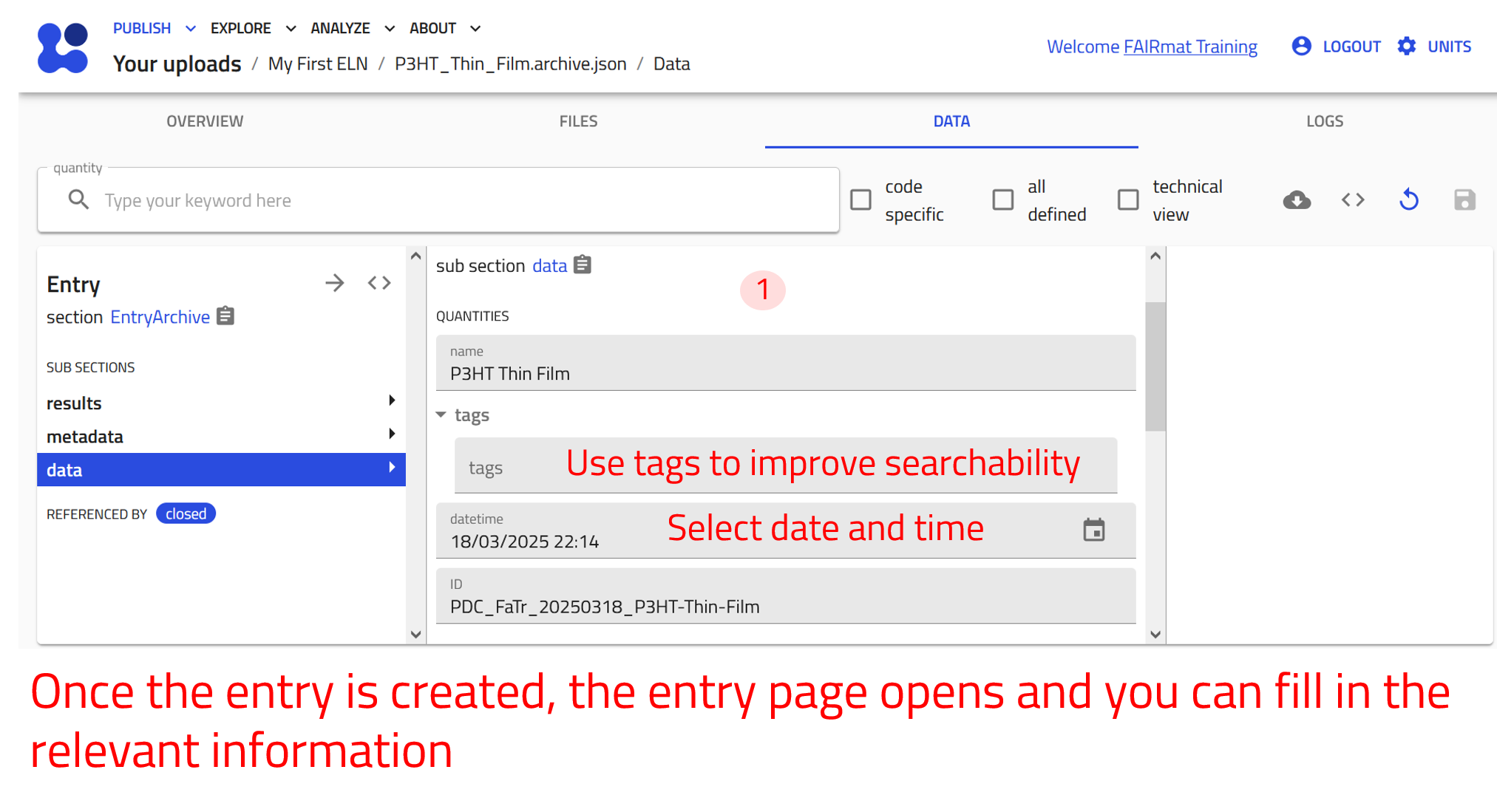 Imagine you have created multiple entries for substances, samples, instruments, processes, and measurements, and you need to quickly find a specific experiment or material. Instead of manually searching through files, NOMAD’s ELN allows you to search, filter, and organize your entries—saving you time and effort.