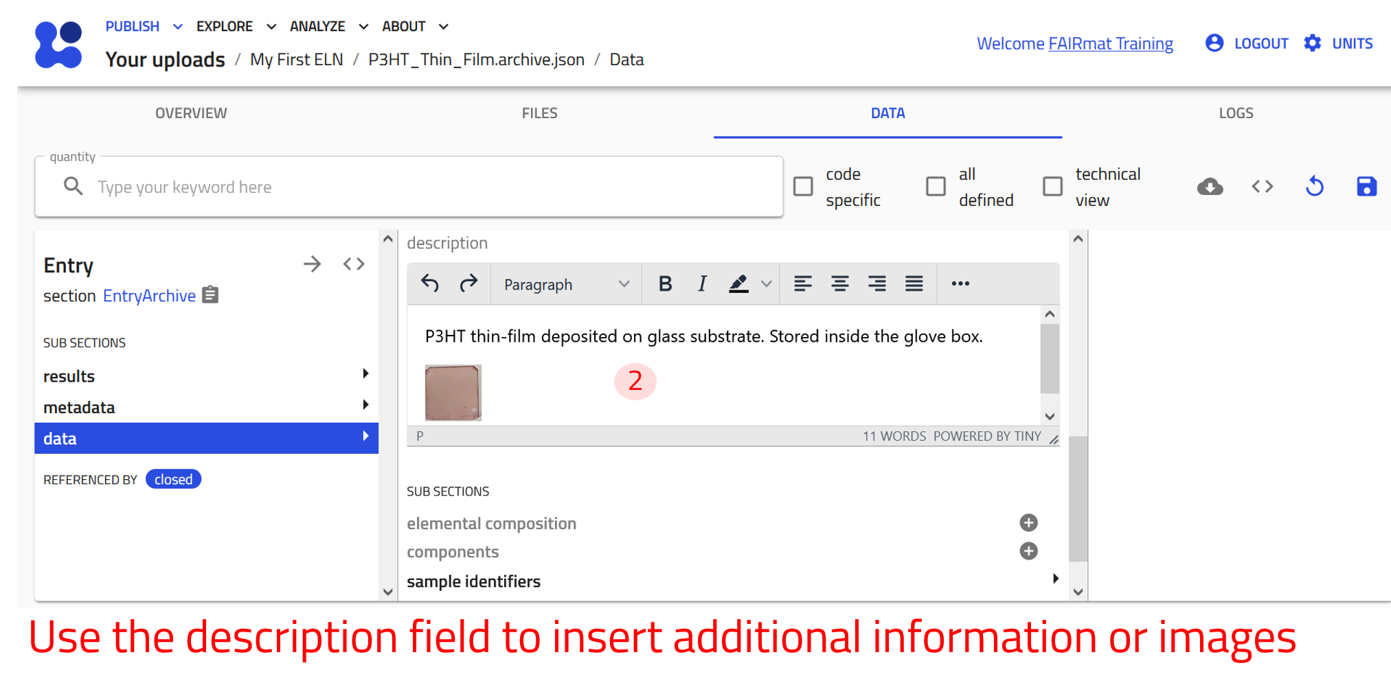 Now create an entry using the built-in Experiment ELN schema for Characterization of P3HT. Follow the steps of creating an entry described above and select Experiment ELN from the drop-down menu in step 4.