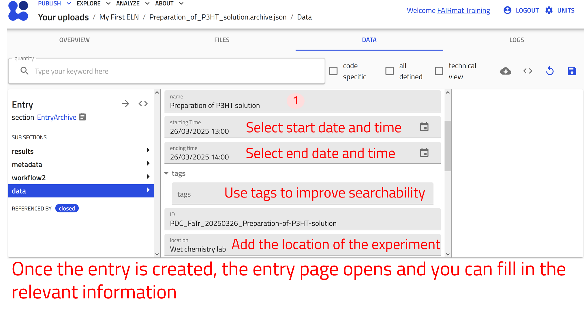 In this tutorial, we use NOMAD’s Electronic Lab Notebook (ELN) functionality to document an experiment in the NOMAD GUI. We follow the experimental workflow from defining substances and instruments to recording processing steps and measurements, using built-in ELN templates to structure and interlink the resulting entries. By the end of the tutorial, we will have documented a complete experiment as a coherent, navigable ELN record in NOMAD.