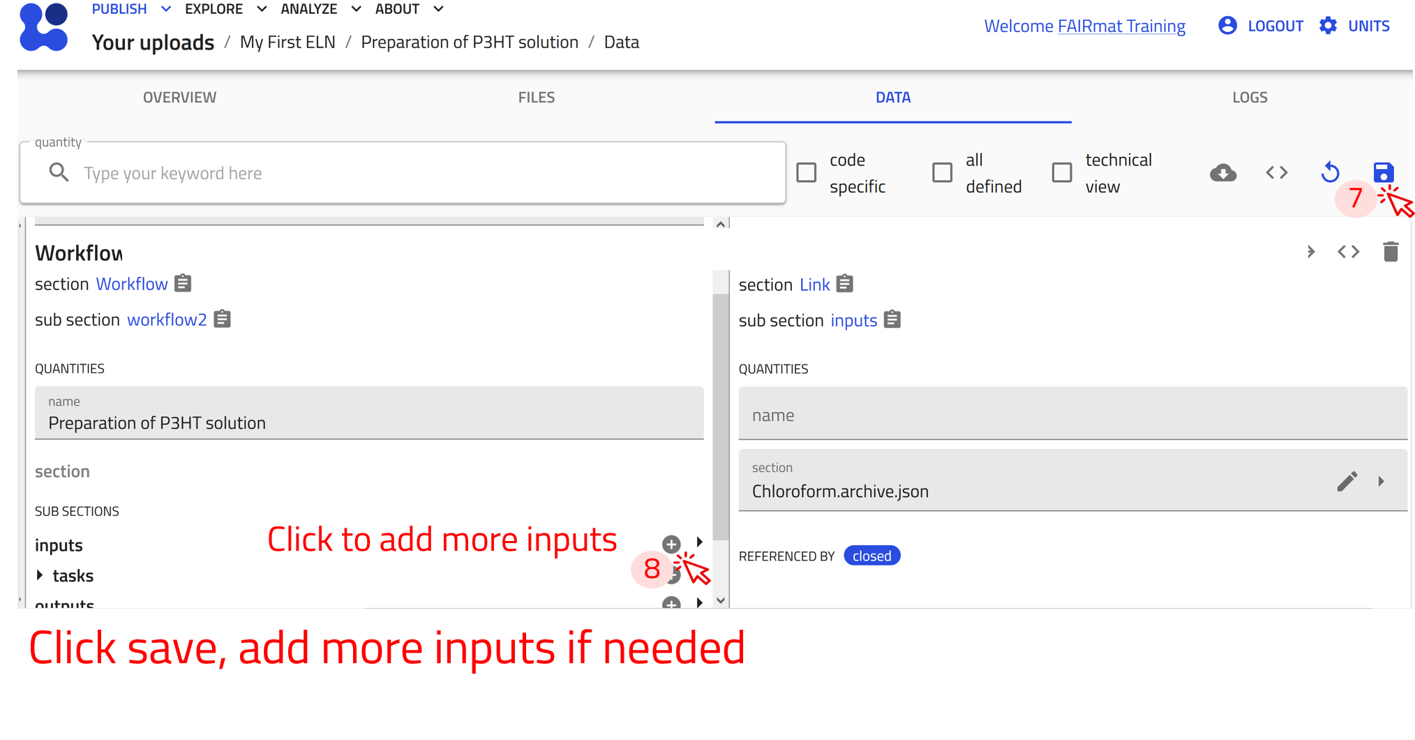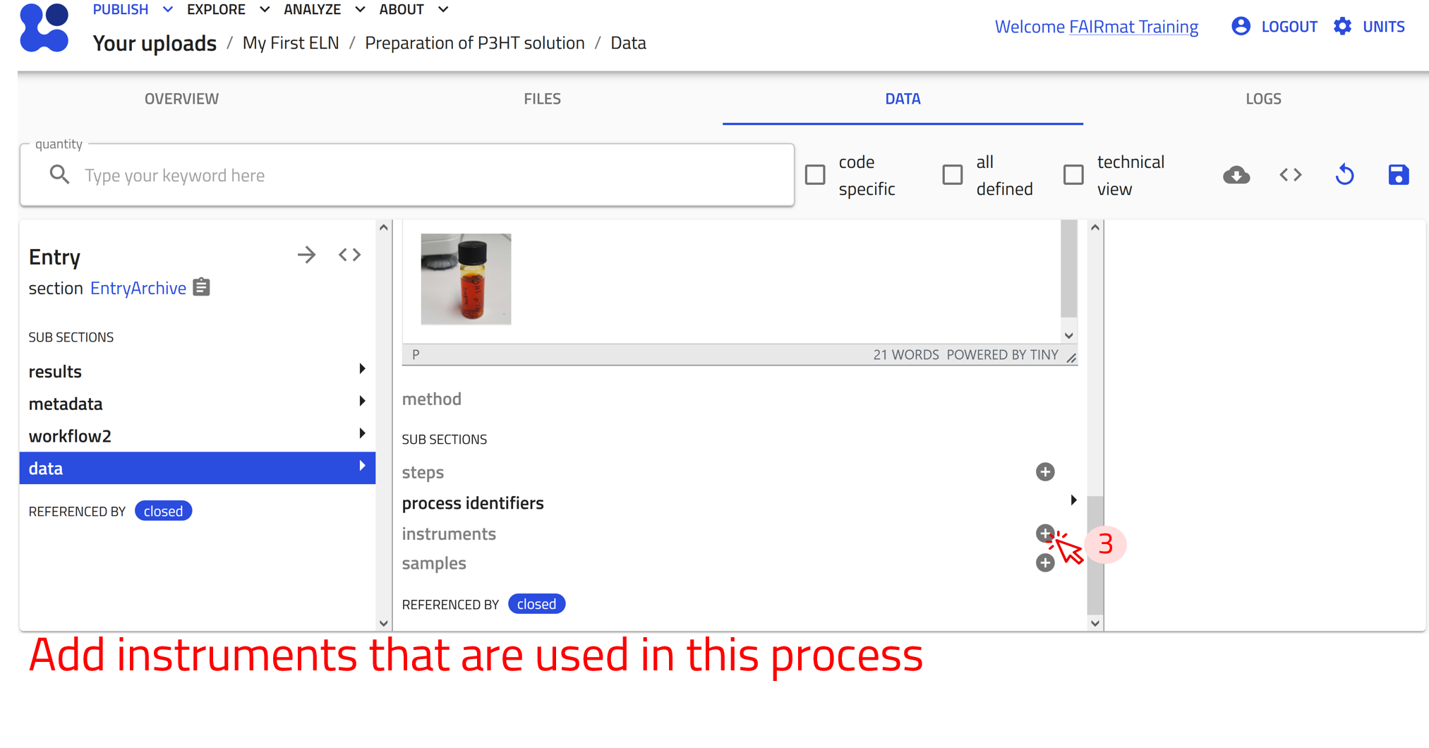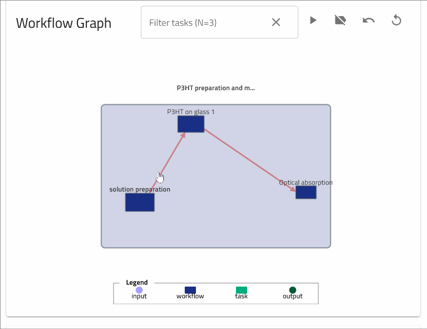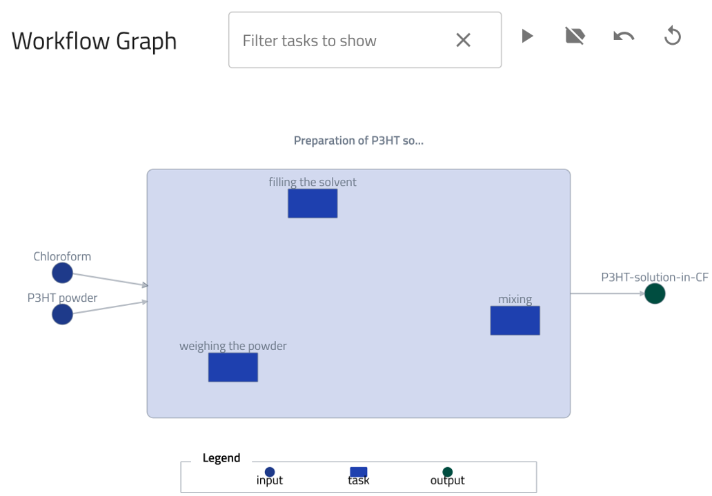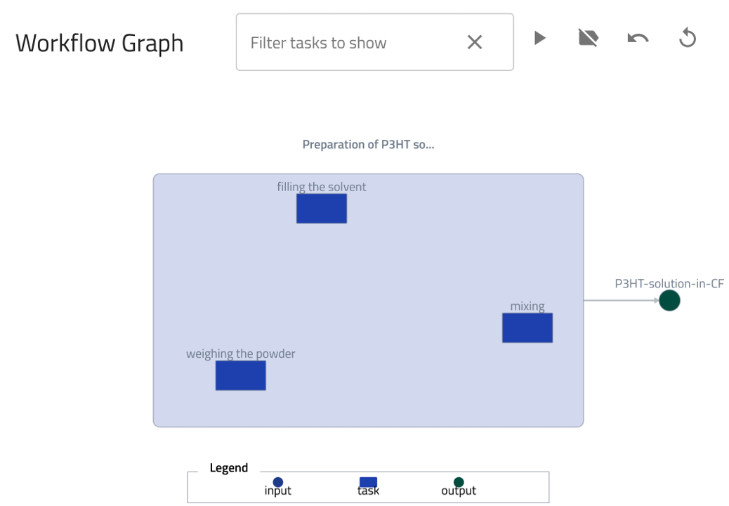 The workflow2 section of the Preparation of P3HT solution example can be found under the DATA tab, in the left panel under workflow2. We can now add inputs by referencing existing substance entries.