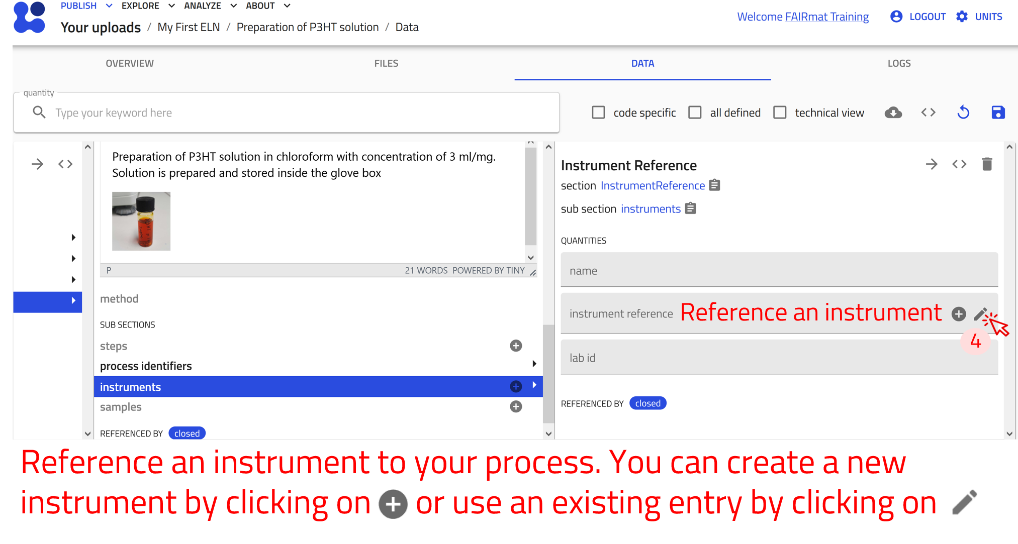 - If the sample entry does not exist, first create a Sample ELN entry named P3HT_solution_in_CF, then add the reference in the Process ELN entry.
