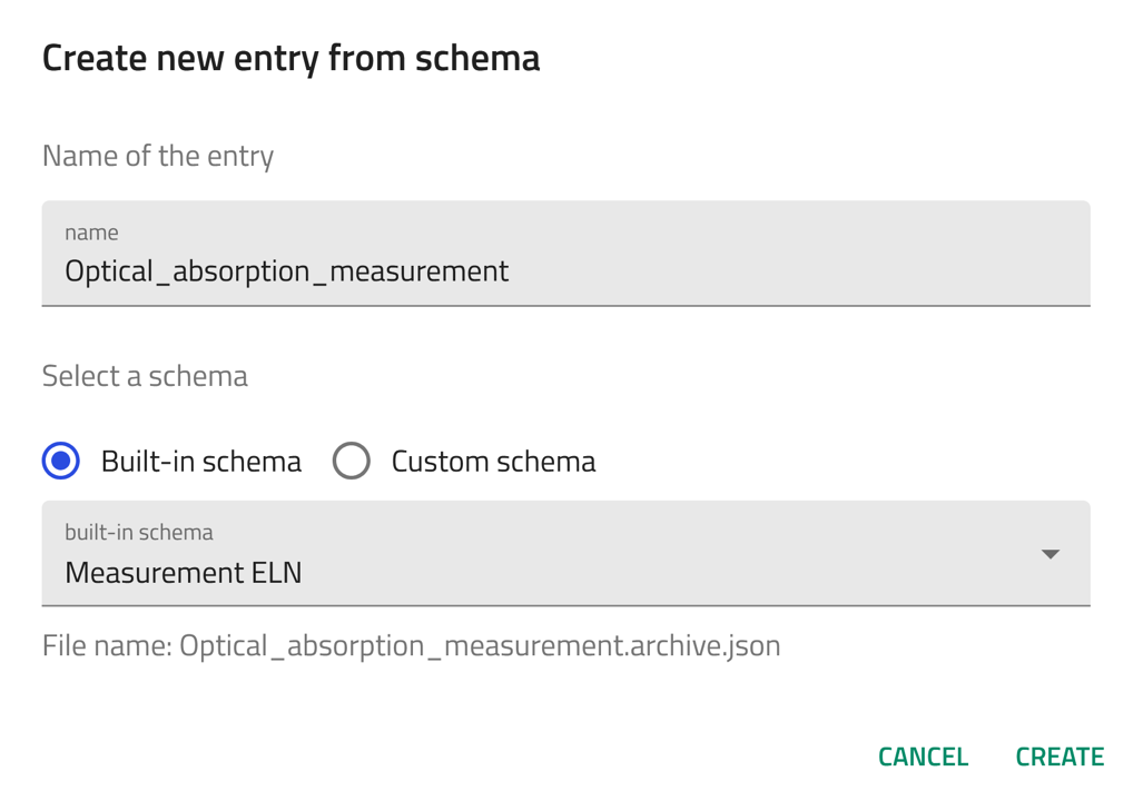 Now, let's create an entry using the built-in Measurement ELN schema for Optical absorption measurement. Follow the steps of creating an entry described above and select Measurement ELN from the drop-down menu in step 4.