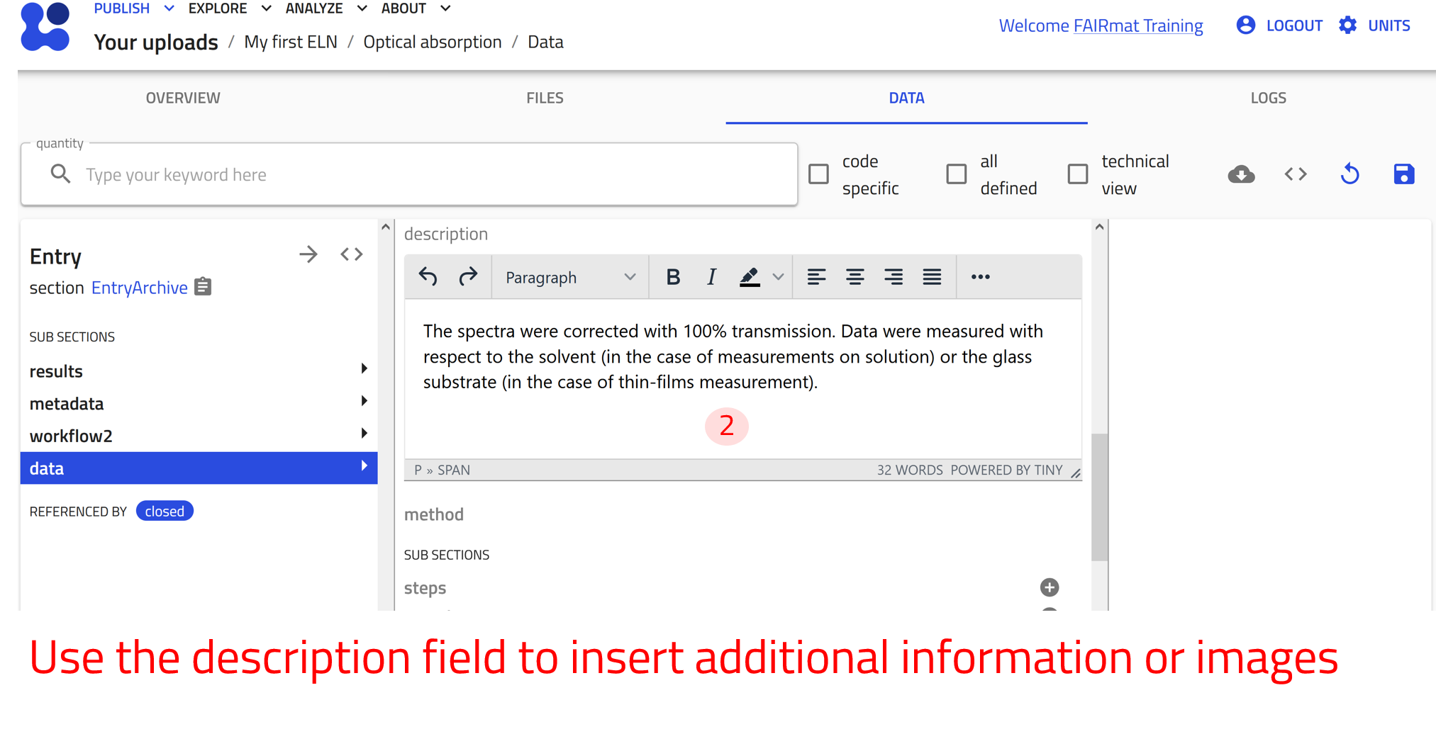 Note that the added information in the subsections will be used to automatically fill in the Workflow Graph as tasks, as well as the References section. You can find the Workflow Graph in the OVERVIEW tab of the entry.