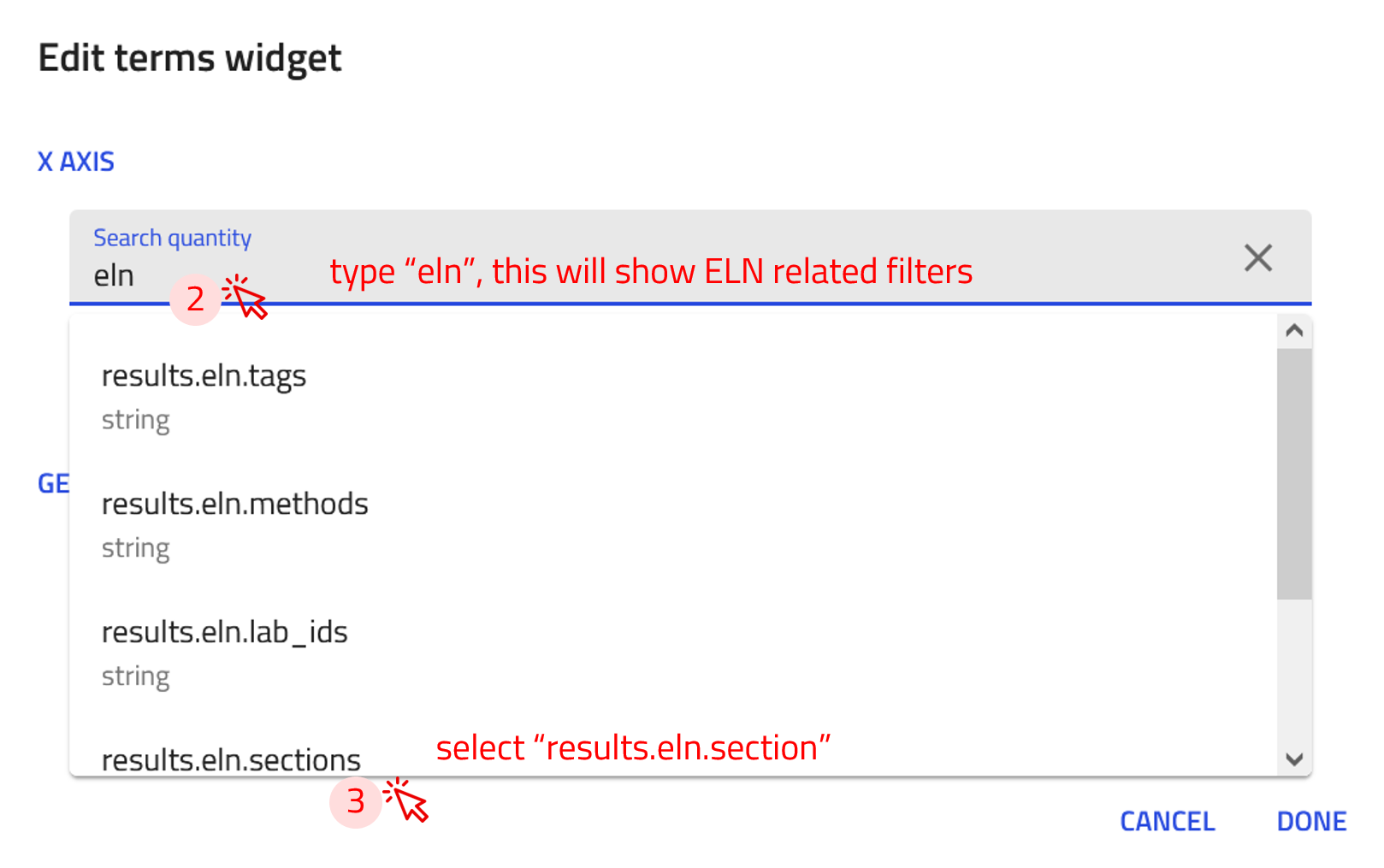 results.eln.sectionsfrom the list. This will enable filtering based on the built-in ELN sections available in your ELN upload.